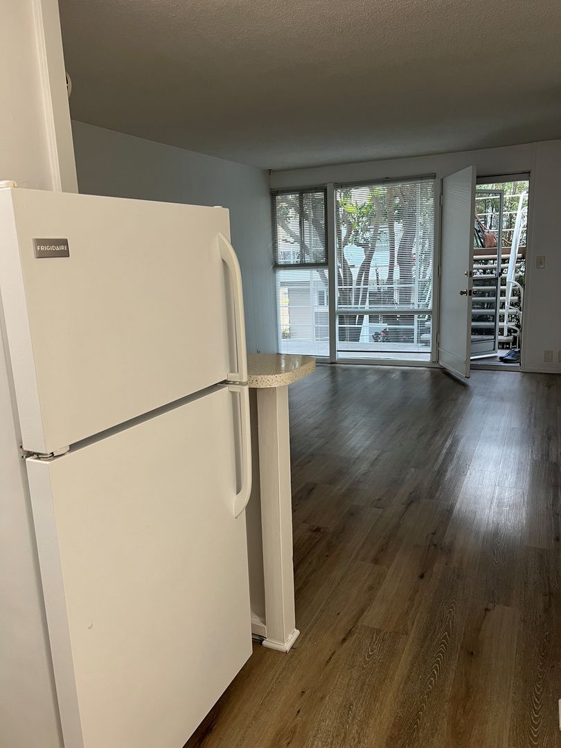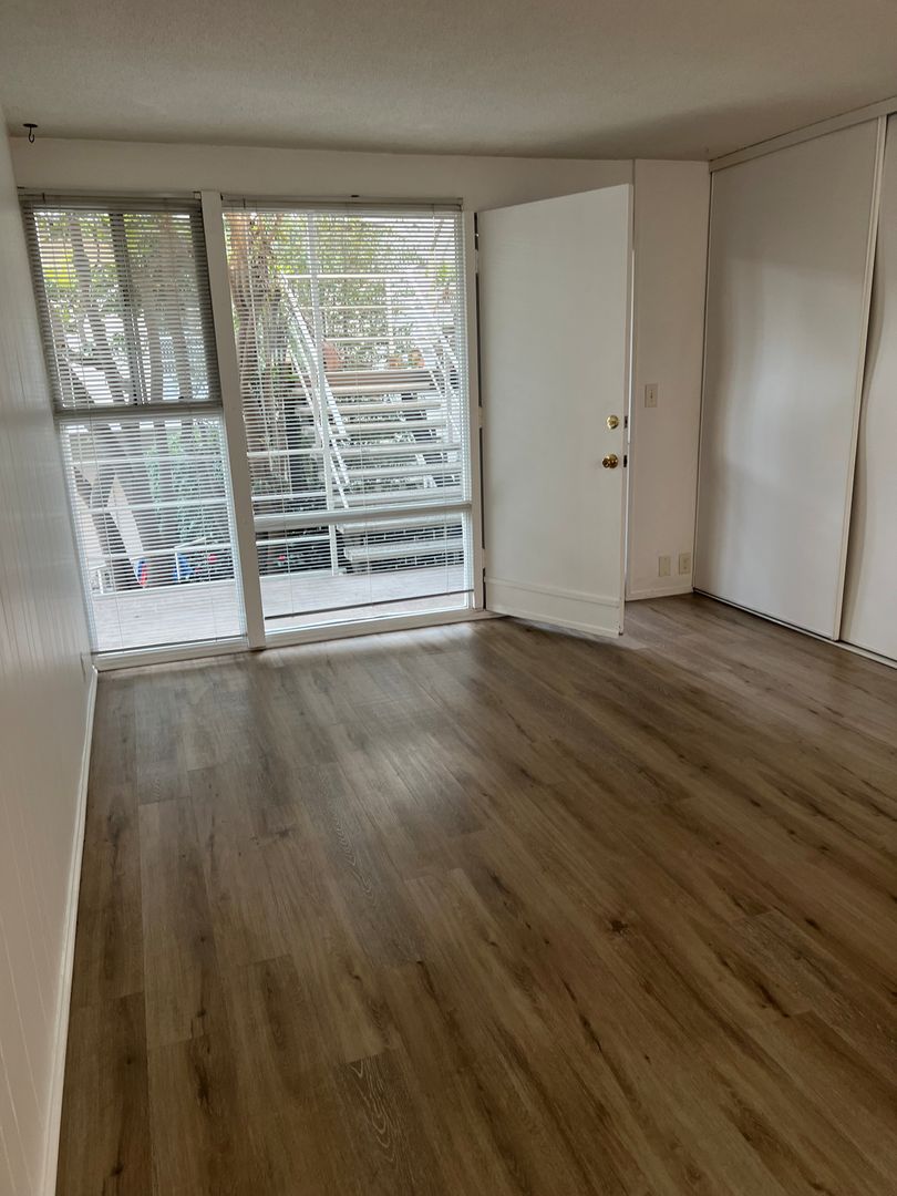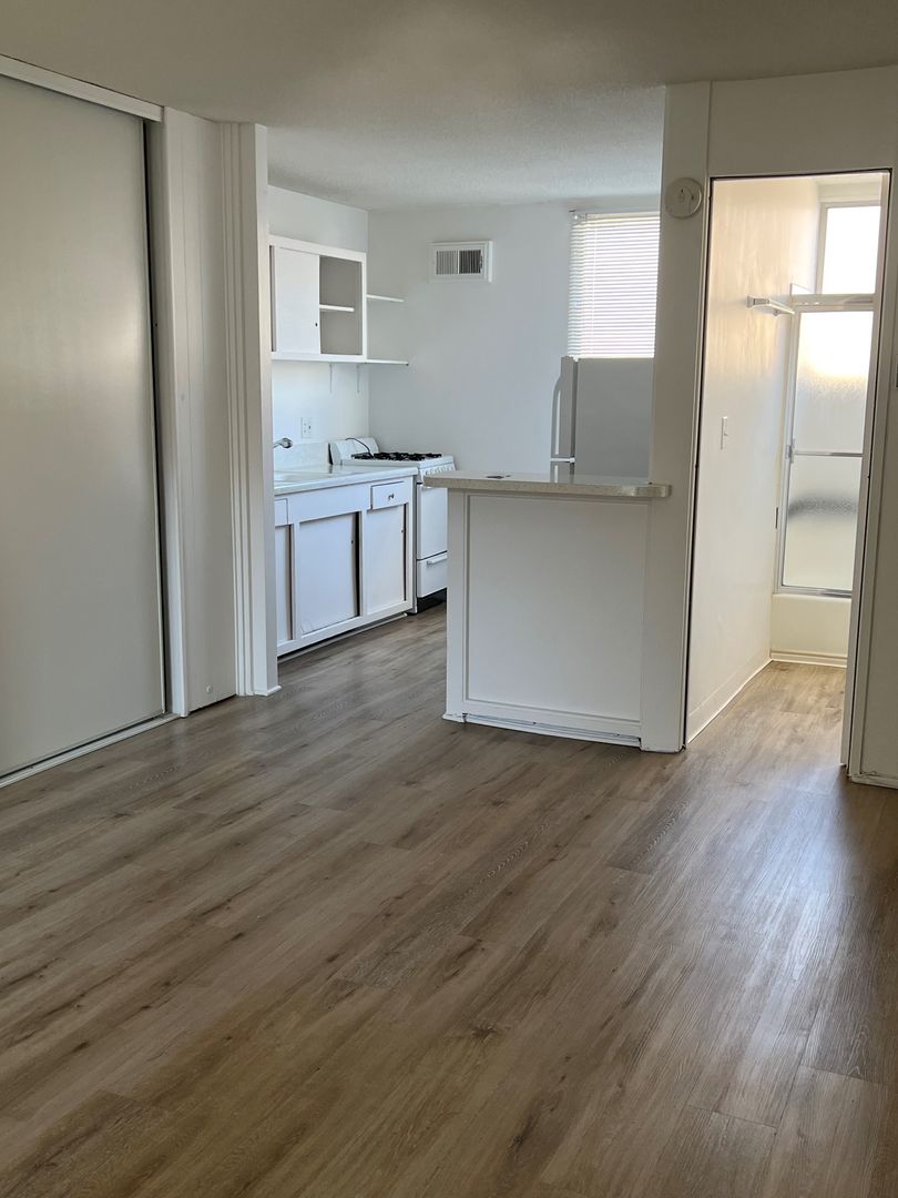 This Studio apartment on the 2nd floor is set back in a beautiful courtyard right across the street from the beach and ocean in Belmont Shores. The apartment has new wood flooring, freshly painted, with floor to ceiling windows that look out to the Ocean & courtyard. The unit has a full kitchen with kitchen cabinets & granite finished countertop, refrigerator & gas stove.